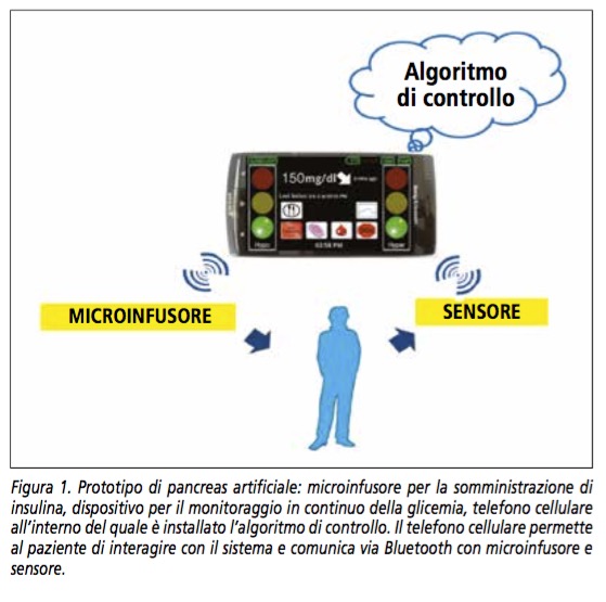 Nei primi prototipi di pancreas artificiale, l’algoritmo di controllo era installato in un computer portatile collegato via cavo al dispositivo per CGM e al microinfusore. Con questo sistema, sono stati condotti diversi studi preliminari, in ambito ospedaliero, al fine di testarne sicurezza ed efficacia. Gli studi hanno dimostrato la superiorità del PA, rispetto alla terapia con microinfusore, nel controllare la glicemia e nel ridurre le ipoglicemie. Il sistema utilizzato era, peraltro, troppo ingombrante per essere utilizzato nella vita di tutti i giorni. Un passo avanti è stato compiuto inserendo l’algoritmo in un telefono cellulare, privato delle funzioni classiche di telefono, in grado di comunicare via bluetooth con gli altri componenti del PA (Figura 1).