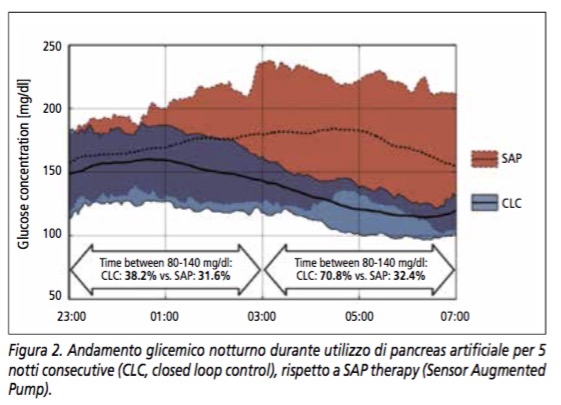 Con questo sistema sono stati intrapresi i primi studi in ambito extra ospedaliero seppure, inizialmente, in ambiente protetto, come ad esempio in un hotel o durante campi scuola, dove, oltre al paziente, risiedevano anche medici e ingegneri, pronti a intervenire per qualsiasi necessità. Questi studi hanno confermato l’efficacia terapeutica del sistema e ne hanno dimostrato la fattibilità e semplicità di utilizzo da parte del paziente. Il nostro gruppo di studio, ad esempio, che collabora con le Scuole di Ingegneria delle Università di Padova (Prof. Claudio Cobelli) e Pavia (Prof. Lalo Magni) e con i colleghi dell’Università della Virginia, ha confrontato l’utilizzo del PA per 5 notti consecutive trascorse in hotel rispetto a 5 notti di terapia con microinfusore e sensore (Figura 2), dimostrando che con il PA si otteneva un aumento del tempo nel range glicemico compreso tra 80-140mg/dl (54.5% vs. 32.2%, p<0.001), una riduzione della glicemia media durante la notte (139.0 vs. 170.3mg/dl, p<0.001) ed un miglioramento della glicemia al risveglio (119.3 vs. 152.9mg/dl, p<0.001).