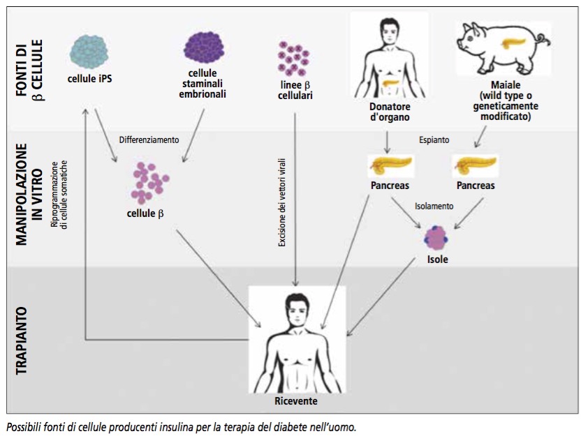 La medicina rigenerativa con cellule staminali ha la potenzialità non solo di trattare, ma di guarire in modo definitivo il diabete e, come in tutti i campi di frontiera, è più che corretto avere una grande fiducia per il futuro, ma è altrettanto necessario mantenere un sano realismo e un doveroso rigore scientifico. L’evoluzione della medicina rigenerativa e lo studio della biologia delle cellule staminali stanno aprendo scenari innovativi nel campo terapeutico. Nonostante questi progressi, al momento tutti i trattamenti con cellule staminali nella sostituzione della funzione beta cellulare non possono essere considerati uno standard clinico e, quindi, vanno considerati puramente sperimentali e da eseguirsi evidentemente solo all’interno di studi clinici approvati. La frontiera più avanzata per le terapie di sostituzione cellulare è costituita dalle cellule staminali pluripotenti, sia embrionali (ESC - Embryonic Stem Cells) che indotte (iPS - Induced Pluripotent Stem). A causa della loro capacità di auto-rinnovarsi e di differenziare in ogni tipo cellulare, le cellule staminali pluripotenti sono considerate la fonte più promettente per terapie di sostituzione cellulare. A coronamento di un lungo percorso di studi preclinici, il 29 Ottobre 2014, ViaCyte, una realtà californiana sostenuta da finanziamenti privati e pubblici, ha annunciato l’inizio di un trial clinico di fase 1/2 (clinicaltrial.gov: NCT02239354) e il trapianto del primo paziente con cellule producenti insulina derivate dalle ESC. Le cellule sono state trapiantate in un dispositivo costituito da una membrana porosa impermeabile alle cellule, chiamato “Encaptra® drug delivery system”. Questo dispositivo è stato creato con l’obiettivo di proteggere le cellule impiantate da un possibile attacco del sistema immunitario, di contenerle permanentemente all’interno e di prevenirne la potenziale distribuzione lontano dal sito d’impianto. Questa è la prima volta in cui è provata, nell’uomo, una terapia di sostituzione ß cellulare basata sulle ESC per la terapia del diabete e rappresenta il culmine di un decennio di sforzi. Nonostante i rilevanti successi ottenuti, tre problemi limitano ancora l’utilizzo in clinica delle cellule producenti insulina derivate dal differenziamento delle ESC. Prima di tutto, data la loro pluripotenza, le cellule indifferenziate sono in grado di portare alla formazione di teratomi in vivo e il trapianto di cellule differenziate non selezionate potrebbe indurre la formazione di tumori causati dalla presenza di alcune cellule indifferenziate residue. Un altro problema irrisolto riguarda l’evidenza che linee diverse di ESC possiedono una differente propensità a dare origine a cellule pancreatiche; di conseguenza, andrebbero provate (con protocolli di differenziamento modificati ad hoc) molte linee cellulari al fine di identificare un set di linee di ESC in grado di facilitare un matching genetico fra donatore e paziente e, quindi, prevenire il rigetto delle cellule trapiantate e l’utilizzo di una terapia immunosoppressiva a vita. L’ultimo grande problema, che attualmente limita l’utilizzo delle ESC in molti paesi del mondo, è la presenza di questioni di tipo etico relative alla distruzione di embrioni umani per la produzione di queste linee cellulari. Per superare questi ostacoli ottenendo ugualmente cellule pluripotenti, il gruppo del Professor Shinya Yamanaka (vincitore del premio Nobel nel 2012 per questa scoperta) nel 2006 è riuscito a riprogrammare cellule somatiche adulte in cellule pluripotenti attraverso l’espressione forzata di 4 geni (OCT4, SOX2, KLF4 e c-MYC) e le ha rinominate cellule staminali pluripotenti indotte (iPSC). Le iPSC conservano le stesse proprietà essenziali delle ESC, inclusa l’abilità di differenziare in ß cellule, ma offrono il vantaggio di permettere la generazione autologa di cellule che potrebbero essere usate per la terapia cellulare. A oggi, il più grande problema delle iPSC, che preclude ancora il loro uso in clinica, è correlato a una loro caratteristica intrinseca: siccome cellule pluripotenti, anche le iPSC determinano la formazione di tumori quando trapiantate in animali immunodeficienti. Altri problemi sono causati dal processo di riprogrammazione stesso, poiché per la trasfezione dei fattori di riprogrammazione sono utilizzati vettori retrovirali integranti che potrebbero causare mutagenesi inserzionale interferendo con la trascrizione di geni e inducendo la formazione di tumori. Per superare questi ostacoli, sono state sviluppate varie strategie: la rimozione dell’oncogene c-Myc dal set di geni richiesto per la riprogrammazione o l’uso di nuove classi di vettori per la riprogrammazione che non integrano nel genoma dell’ospite diminuendo in tal modo drasticamente il rischio di tumorigenesi senza alterare la pluripotenza.